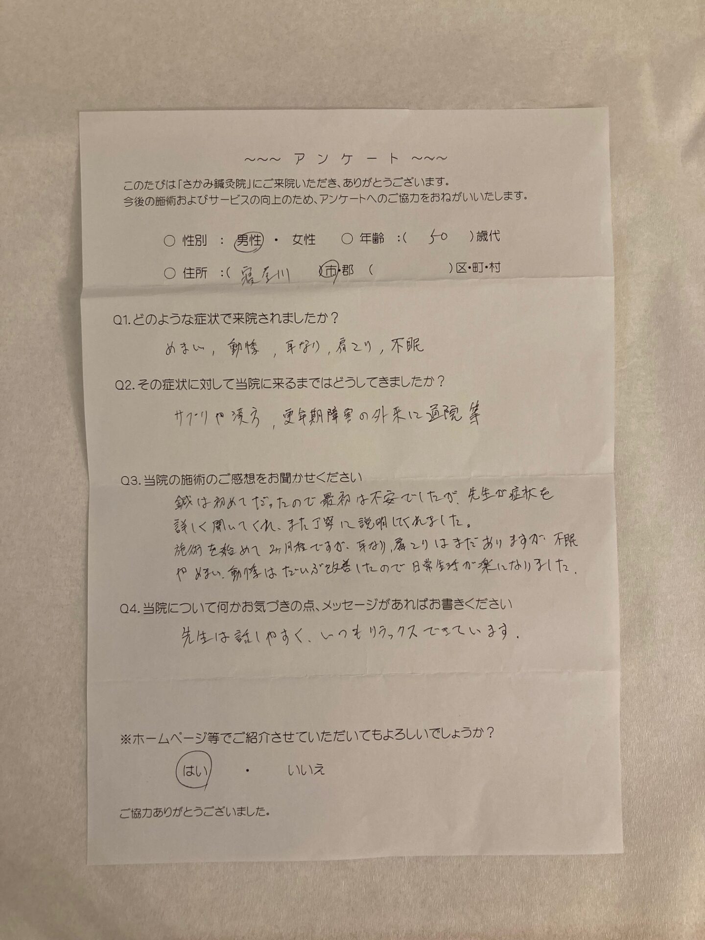 施術を始めて2か月程ですが、耳鳴り、肩こりはまだありますが、不眠やめまい、動悸は大分改善したので日常生活が楽になりました。