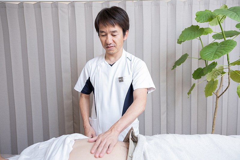 続いて、症状のある部位やその関連部位、背中、お腹に施術を行います。 また、必要に応じてお灸や温灸器なども行います。